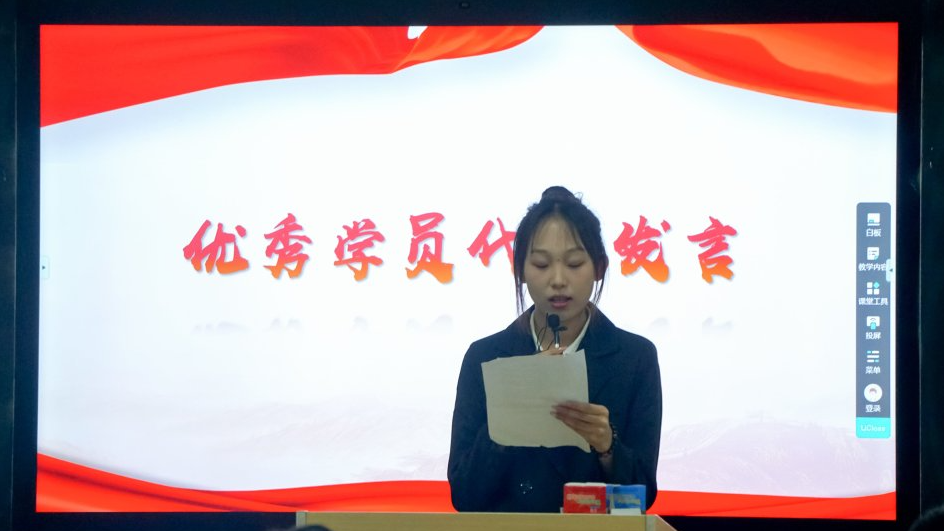 培训班优秀新学员代表软件2206班丁雨婷的发言催人奋进,她表示将在积极分子培训班的帮助下,结合自身不断努力,认真学习党的理论知识,在向党组织靠拢的道路上乘风破浪,树立共产主义的坚定信念,信心满怀地迎接祖国的灿烂明天。