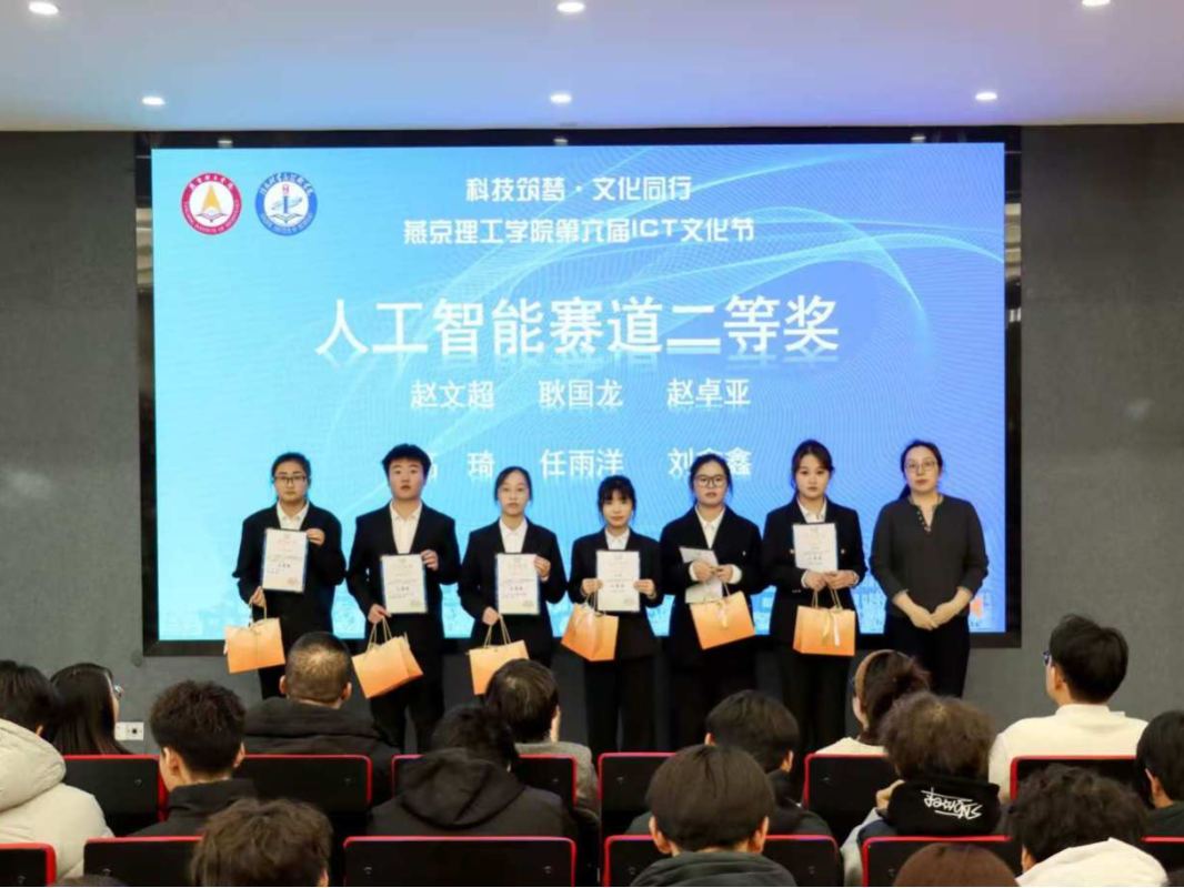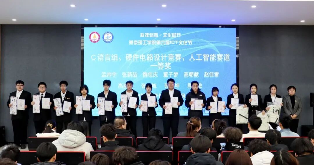 科技为笔,创新作答 为深入贯彻创新型人才培养战略,持续深化科技教育改革,全面提升学生在信息科技领域的实践能力与创新素养,燕京理工学院信息科学与技术学院于2025年12月24日在M101举办第六届ICT文化节闭幕式。与会人员包括信息科学技术学院院长李丽芬,党总支副书记刘伟,社团管理部指导老师李坤,人工智能竞赛负责人姚浩老师,C语言竞赛负责人季婷婷老师,各年级辅导员代表。 01 第六届ICT文化节—闭幕式 活动以播放ICT文化节回顾视频开启,视频全景式呈现了本届ICT文化节从赛事筹备到作品创作的全过程,清晰展现了学生在ICT领域的实践探索与能力成长,也让在场师生直观感受到ICT文化节的科技氛围与育人成效。 颁奖环节 颁奖环节,领奖人员陆续上台。经多轮比拼,最终评选出一等奖十六名、二等奖二十九名、三等奖四十五名、优秀奖三十五名。本届文化节设置C语言程序设计、硬件电路设计、人工智能算法等竞赛赛道,赛事对标教育部白名单赛事搭建校赛至国赛的人才选拔体系,内容覆盖软件硬件及底层上层应用。学院领导依次为获奖学生颁发证书,现场掌声持续不断,既是对获奖学子专业能力的认可,也彰显了学院对ICT人才培养的重视。 C语言组、硬件电路设计竞赛、人工智能赛道一等奖 C语言组、硬件电路设计竞赛、人工智能赛道二等奖 C语言组、硬件电路设计竞赛、人工智能赛道三等奖 算法学习经验分享 优秀作品展示环节中,学生代表带来垂类大模型3D模型、智能陪伴机器人等成果分享,其中同学们用3D建模构建了一个生动的视频阐述了感恩,另外智能陪伴机器人融合娱乐陪伴,语言输出功能并且同学们将它制成成了小狗的模样,给人们提供更多的乐趣,能简单执行人们的命令,实现了专业知识与社会需求的有机结合,展现出学生将理论转化为实践的创新能力,获得现场师生的广泛好评。充分彰显青年学子以科创赋能生活、以专业践行担当的青春风采,为学科应用与人才培养注入鲜活动力。 信息科学与技术学院院长李丽芬发表总结发言,首先向为本届ICT文化节付出努力的师生致谢,向获奖同学表达祝贺。指出本届ICT文化节赛事设计对标蓝桥杯、全国大学生电子设计大赛等高水平赛事,以赛促学的模式为学生搭建了能力提升的平台。李院长分享走访多所高校的感悟,以及学院师生在各类学术论坛中的表现,强调学生应树立终身学习理念,打破认知局限。也表示学院将于2026年举办更多校级学科竞赛,持续为学生提供实践平台,助力学子在ICT领域深耕发展。最后,李院长勉励学生保持对信息科技的热爱,以自信姿态参与更高层次的学术与竞赛交流,将所学知识转化为推动行业发展的动力。 信息科学与技术学院院长李丽芬发表总结发言 本届ICT文化节的举办丰富了校园科技文化生活,让学生在竞赛与实践中锤炼了专业技能、培养了创新思维,有效激发了学生对信息科学领域的探索热情。未来,信息科学与技术学院将继续秉持四会五有高素质应用型人才培养理念,深化产教融合,优化教育教学体系,持续推动科技教育与人才培养工作提质增效,为国家信息科学事业发展输送更多人才。