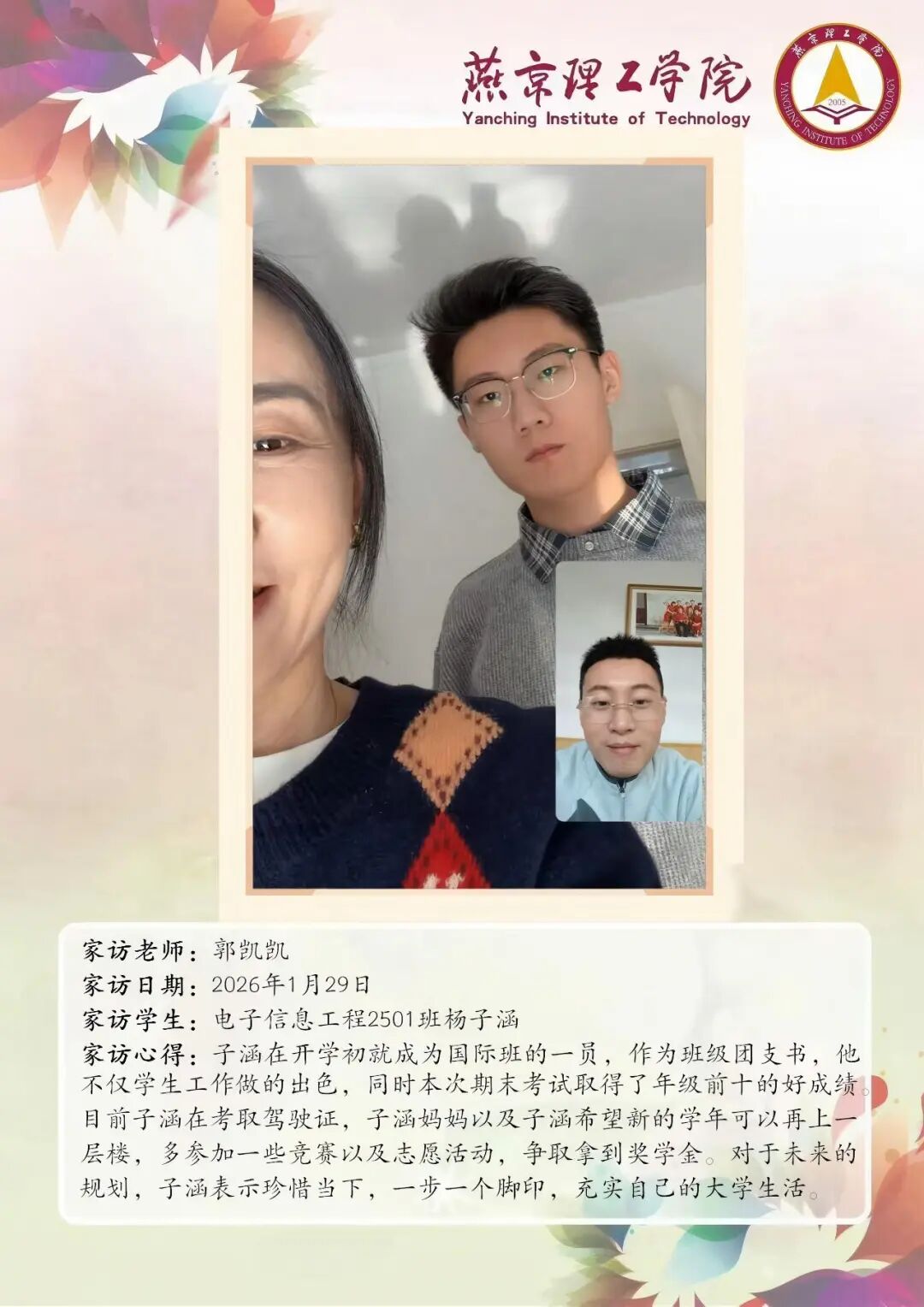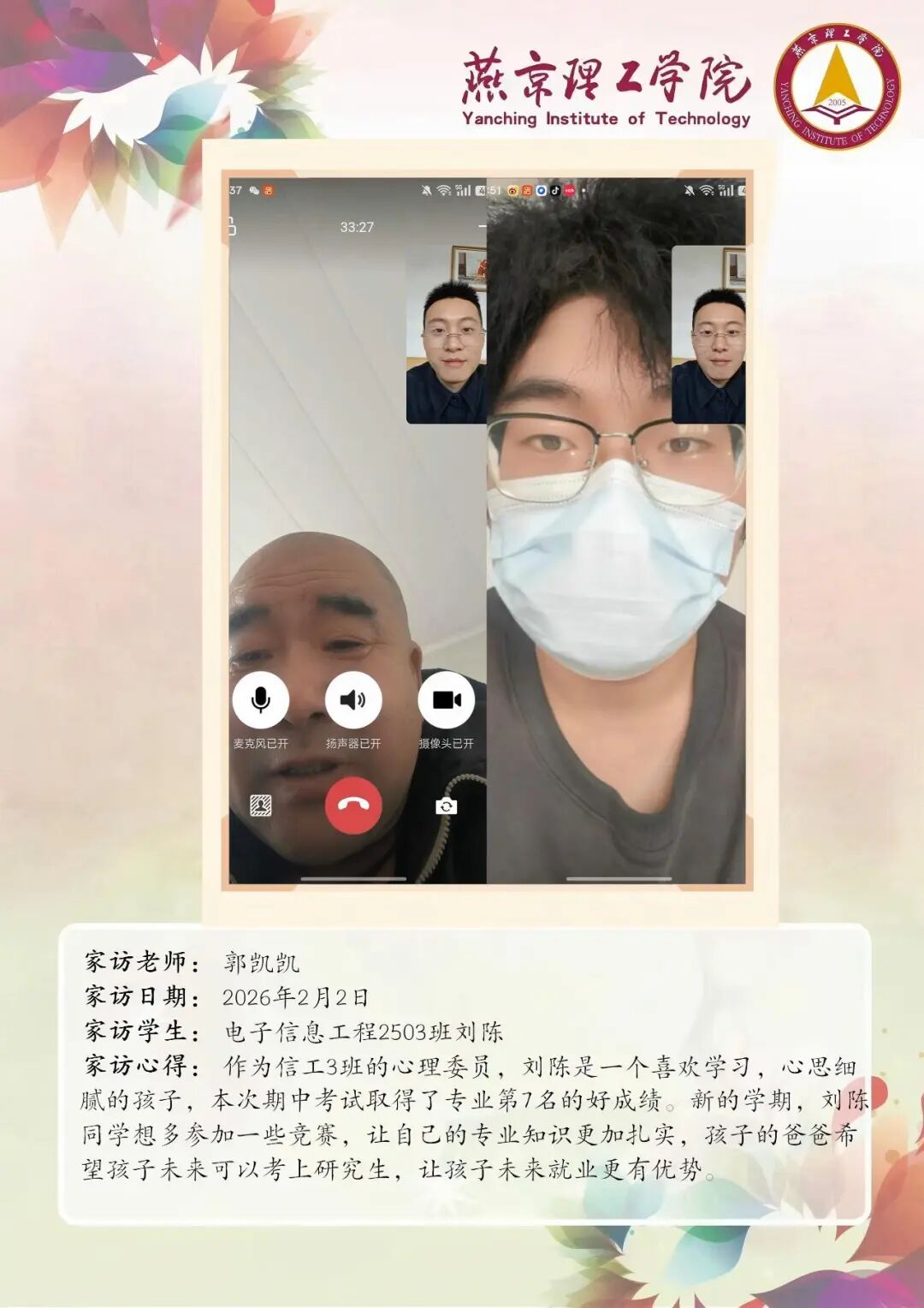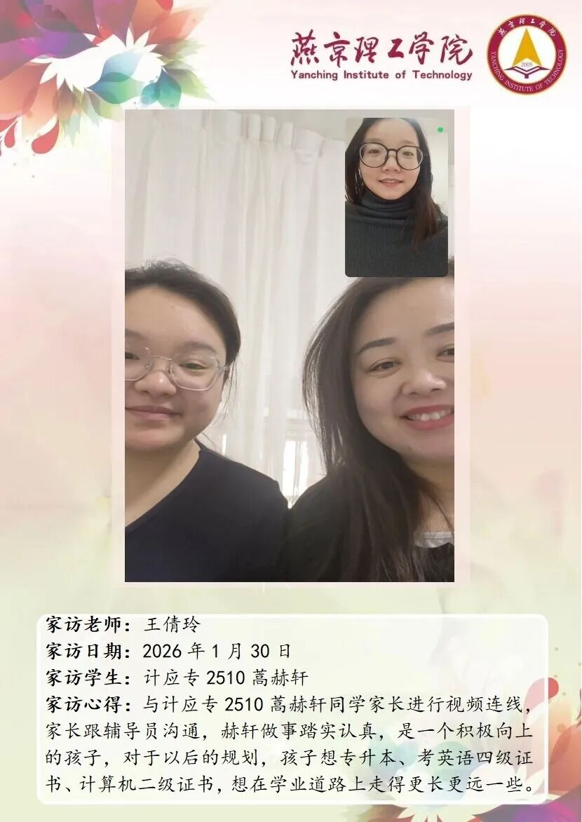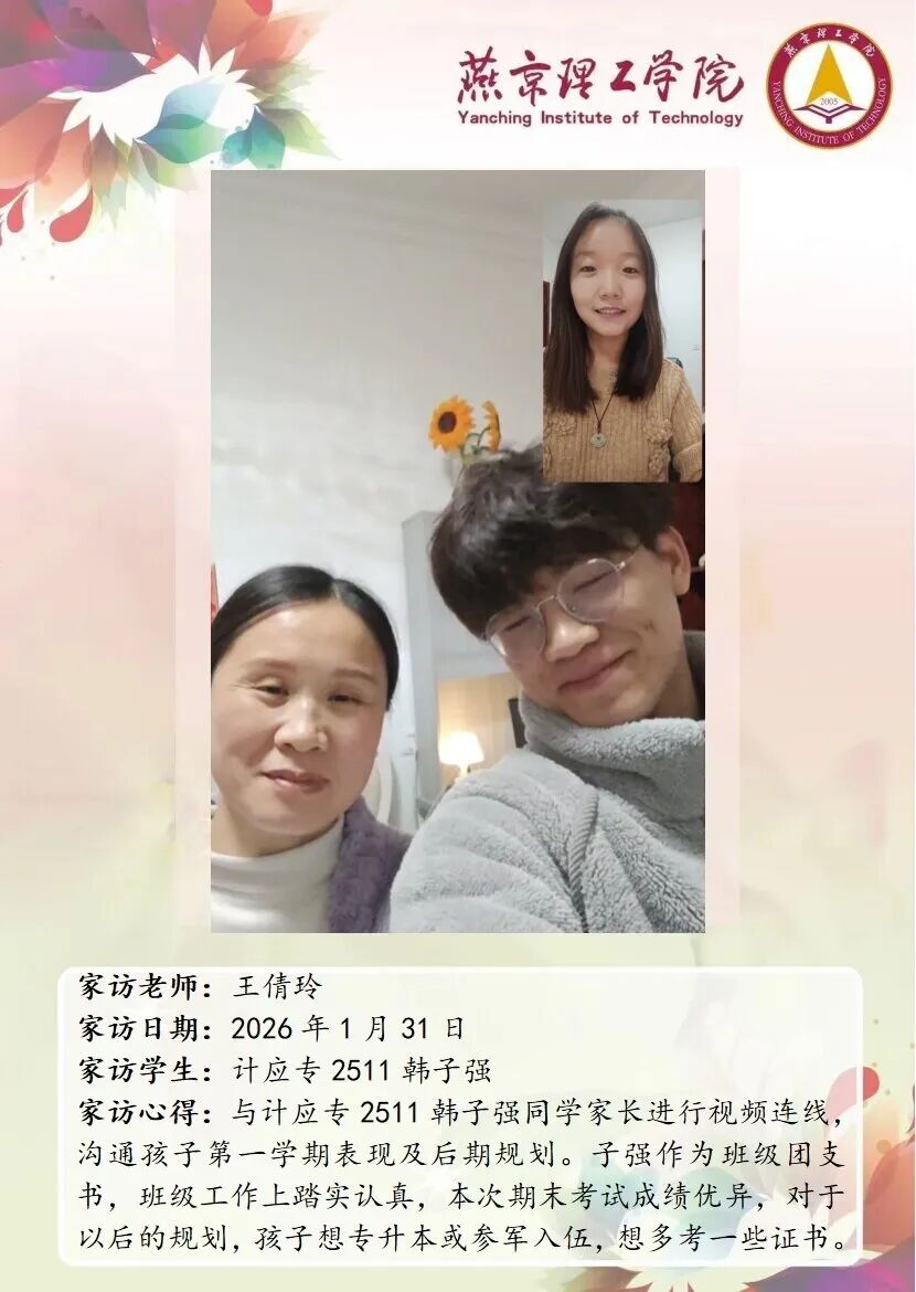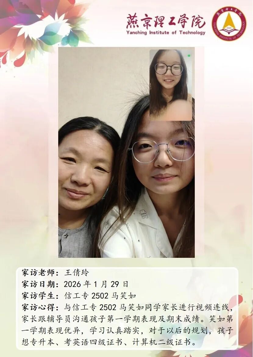 为切实关注学生成长发展,完善家校协同育人机制,信息科学与技术学院扎实开展 2026 年寒假大家访活动。老师们围绕学生的学业提升、实践能力培养、未来发展规划等问题,与家长开展深度探讨,凝聚起家校共育的思想共识与行动合力。王倩玲老师郭凯凯老师 通过本次大家访活动,学院进一步加强了与学生家庭的双向沟通,为后续人才培养工作明晰了方向。学院将持续深耕家校协同育人模式,整合校内外育人资源,推动专业教育与思想政治教育深度融合,不断提升人才培养质量。