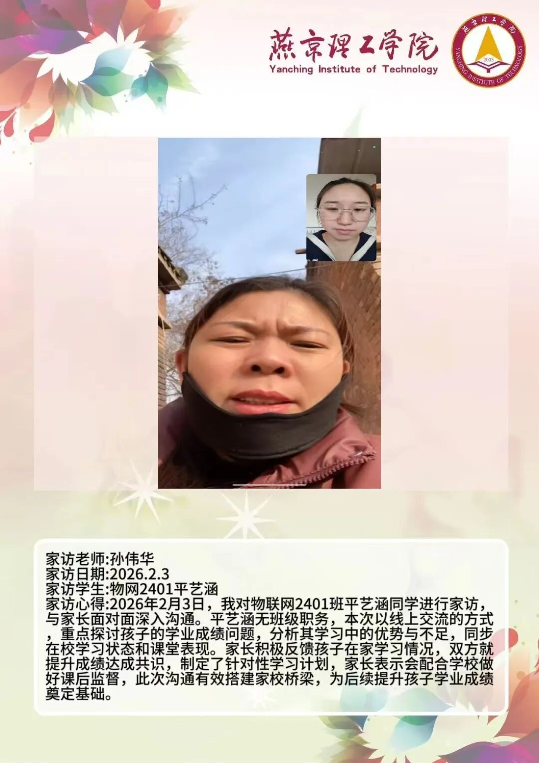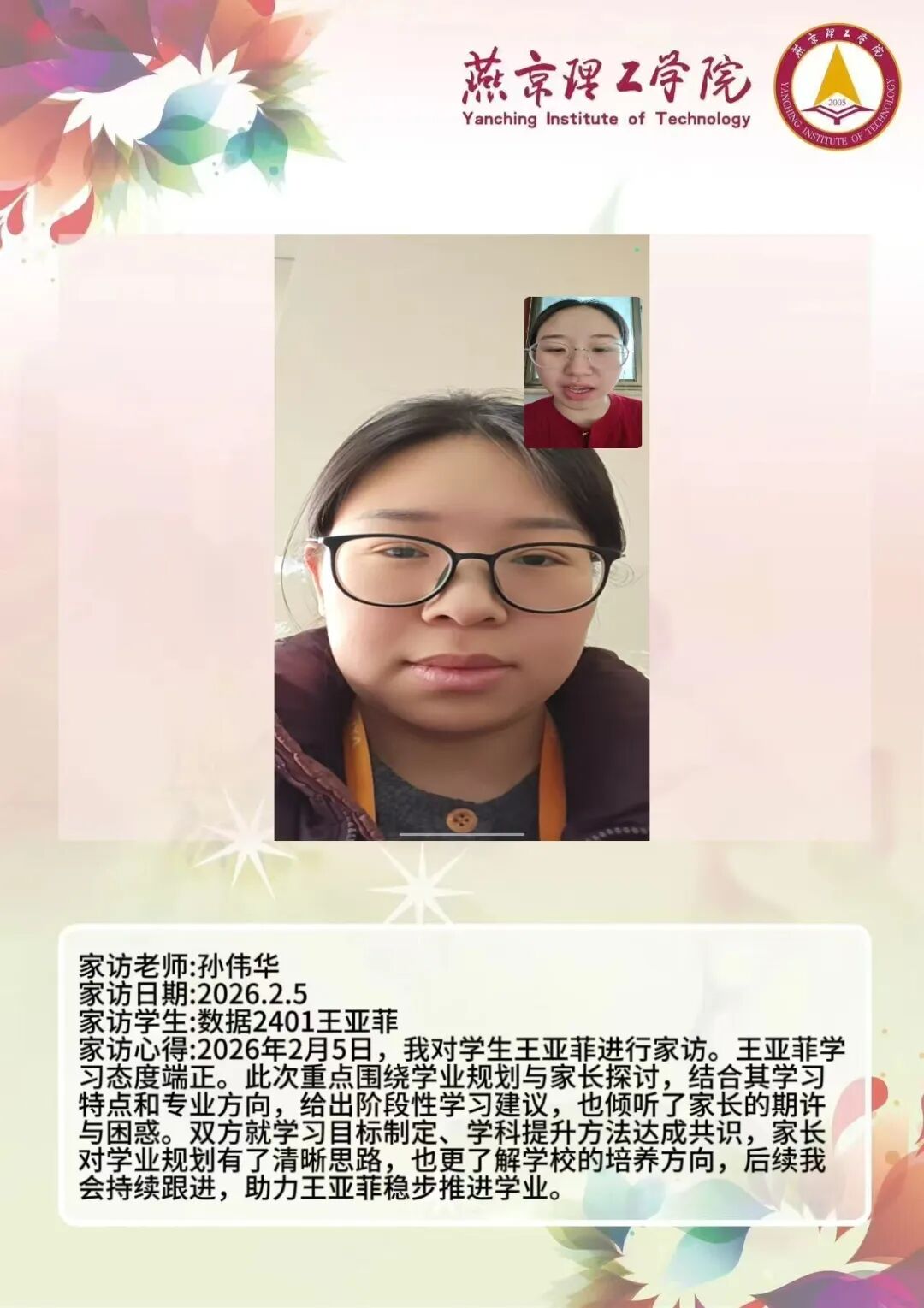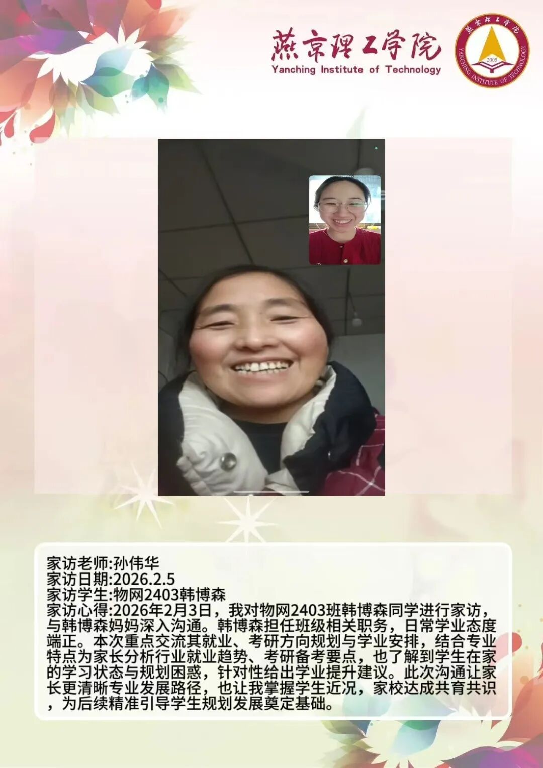 通过本次大家访活动,学院进一步加强了与学生家庭的双向沟通,为后续人才培养工作明晰了方向。学院将持续深耕家校协同育人模式,整合校内外育人资源,推动专业教育与思想政治教育深度融合,不断提升人才培养质量。