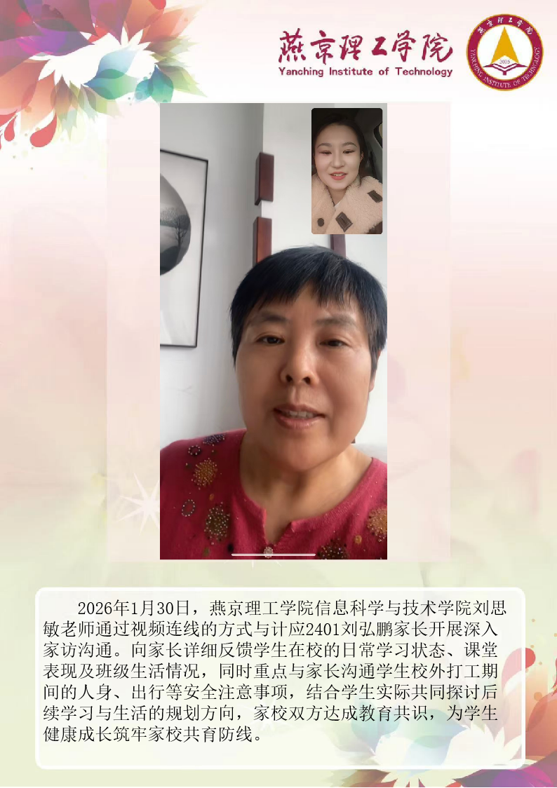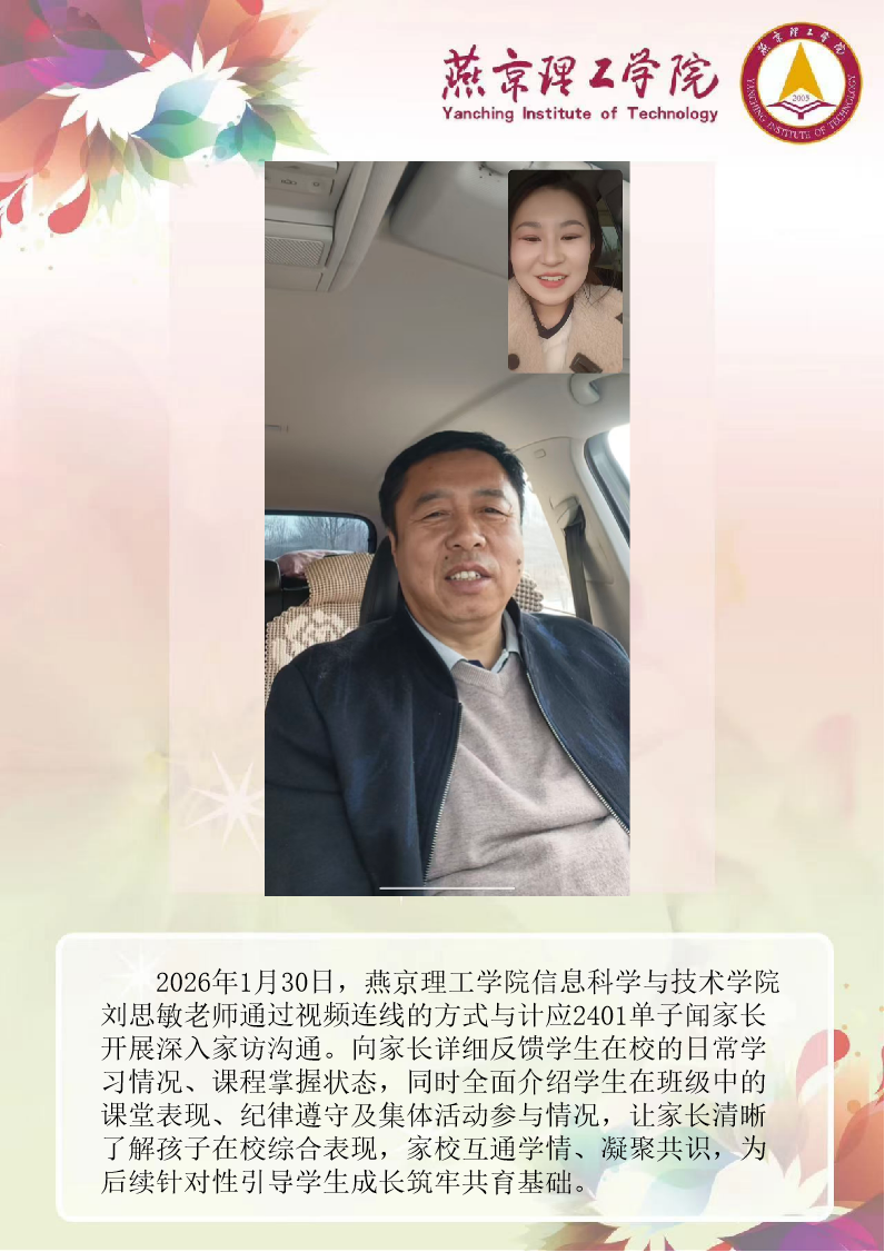 为切实关注学生成长发展,完善家校协同育人机制,信息科学与技术学院扎实开展 2026 年寒假大家访活动。老师们围绕学生的学业提升、实践能力培养、未来发展规划等问题,与家长开展深度探讨,凝聚起家校共育的思想共识与行动合力。刘思敏老师 孙伟华老师通过本次大家访活动,学院进一步加强了与学生家庭的双向沟通,为后续人才培养工作明晰了方向。学院将持续深耕家校协同育人模式,整合校内外育人资源,推动专业教育与思想政治教育深度融合,不断提升人才培养质量。