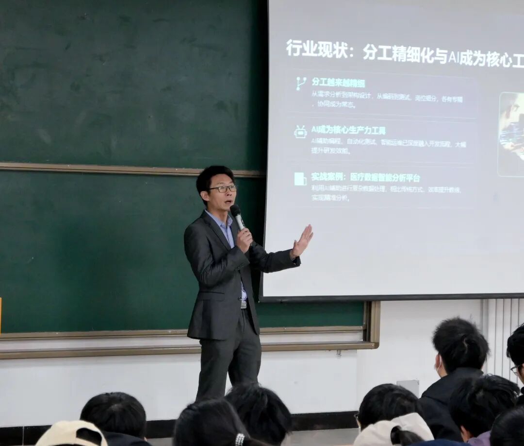 为助力计算机科学与技术专业大一学子明晰行业方向、规划学习生涯,信息科学与技术学院(新E代数智未来产业学院)于3月21日在综合楼203举办《人工智能发展趋势及对计算机专业学习与就业的思考》主题讲座,本次讲座特邀资深软硬件研发专家孙志刚主讲,深度解读AI时代下的专业发展路径。 讲座伊始,孙志刚专家以行业发展现状为切入点,结合多年软硬件研发实战经验,系统梳理了当前软件开发行业的整体格局,为同学们搭建起清晰的行业认知框架。他从技术迭代周期、市场需求变迁等维度展开分析,直观呈现了AI时代对计算机专业人才提出的全新挑战与机遇。 讲座中,专家结合医疗数据AI智能应用、大模型与知识库建设、AI编程、医疗器械软硬件设备研发等真实案例,具象化讲解AI与软件开发的融合场景,帮助同学们拓宽专业认知、激发学习兴趣。他通过鲜活的实践故事,生动解析了技术落地细节,让抽象的行业趋势变得通俗易懂。 针对学习规划困惑,孙志刚专家给出大学四年能力提升与就业规划的实操建议,从课程学习、实践培养到职业选择层层拆解,为同学们明确成长方向,找准职业定位。他强调夯实编程基础、提升问题解决能力的重要性,同时鼓励大家积极参与科创实践,构建符合行业需求的核心竞争力。 此次讲座搭建了行业前沿交流平台,有效解决了同学们的专业认知与生涯规划难题。未来,信息科学与技术学院将持续开展此类活动,助力学子夯实基础、紧跟时代,成长为高素质专业人才。 为助力计算机科学与技术专业大一学子明晰行业方向、规划学习生涯,信息科学与技术学院于3月21日在综合楼203举办《人工智能发展趋势及对计算机专业学习与就业的思考》主题讲座,本次讲座特邀资深软硬件研发专家孙志刚主讲,深度解读AI时代下的专业发展路径,信息科学与技术学院姚浩老师出席本次活动。