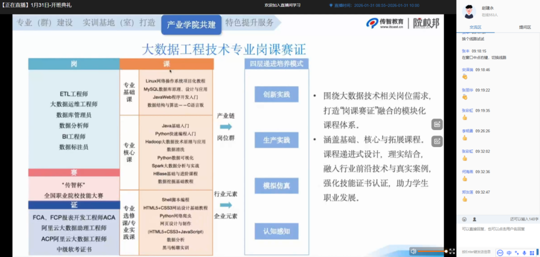 为深化产教融合,夯实师资队伍数智化教学能力,紧跟人工智能、大数据等前沿技术发展步伐,1月31日至2月4日,燕京理工学院信息科学与技术学院(新E代数智未来产业学院)大数据教研室周雪、邵芬红、王亚楠、赵建永四位教师,参与了传智播客举办的线上专项培训,聚焦技术实操与项目落地,实现专业能力精准提升。 本次培训紧扣行业发展需求与教学实际,四位教师结合自身教学研究方向,选择不同专项深耕细研,实现精准赋能。周雪、邵芬红两位教师参与AI+Python+大数据领域培训,深耕结构化流技术,围绕陌陌聊天分析开展实时统计项目实战。培训内容主要为数据清洗、结构化流窗口优化及结果可视化呈现,熟练运用PySpark构建实时数据处理链路,针对聊天数据中的冗余信息、异常值完成精准过滤,优化Watermark水印机制规避数据延迟问题,最终实现聊天频次、热门话题、用户互动热度等指标的实时统计与可视化展示,系统掌握了大数据实时处理的核心逻辑与实操方法,破解了海量结构化数据高效分析的技术难点,为后续数据挖掘、智能分析相关课程教学积累了鲜活案例。 王亚楠教师参与人工智能大模型开发与应用专项培训,以ReAct架构为核心,开展扫地机器人Agent开发实践。培训期间,老师聚焦智能体的环境感知、任务规划与动态决策能力搭建,基于ReAct思维链机制设计多轮推理逻辑,整合视觉识别模块与路径规划算法,实现扫地机器人对复杂家居环境的精准感知、障碍物规避及清洁任务的智能分配,同时完成Agent与大模型的接口调试、交互逻辑优化,解决了智能体执行效率低、决策不精准等问题,掌握了基于ReAct思维链机制的智能体开发流程,熟悉了动态技能调用、环境主动感知等关键技术,助力推动人工智能课程与实战场景深度融合。 赵建永教师参与前端开发专项培训,专注Vue3+Typescript技术栈,完成优医问诊前端实战项目开发。培训期间,老师熟练运用TypeScript的类型安全特性优化代码架构,规避类型错误、提升代码可读性与可复用性,依托Vue3 Composition API实现高效组件开发,拆解页面模块、封装通用组件,兼顾前端界面交互性与代码可维护性,同时梳理前端项目开发流程、优化调试方案,切实提升了前端开发实战能力与项目管控水平,为后续前端相关课程教学融入实战技术要点奠定基础。 此次培训依托新E代数智未来产业学院的产教融合平台优势,结合传智播客的优质教学资源,采用“理论精讲+项目实操”的模式,打破地域限制,实现优质资源精准对接。培训过程中,教师们主动交流探讨,将行业前沿技术与教学实践深度结合,既夯实了技术功底,又积累了贴合行业需求的教学案例,有效弥补了理论教学与产业实践之间的差距。