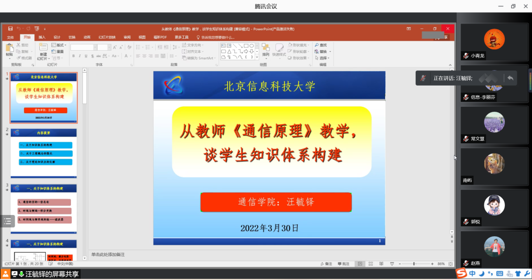 会议伊始,汪毓铎教授简要提出三点论题:知识体系的构建、工程概念的强化、理论知识点的化解。随后,汪毓铎教授就“关于知识体系的构建”的问题,解答围绕通信的目的,并借助通信相关的两个方面进行了详细的解析。这种知识体系的构建可以帮助学生理清思路,帮助老师向学生讲解相关知识,提高老师的教学质量。
